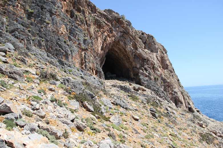 Auf der anderen Seite des Schluchtbettes gelangen wir auf einem Treppenweg zu einer felsigen Anhöhe hinauf, von der wir bereits den noch ein gutes Stück vor uns liegenden Höhleneingang von Agios Antonios ausmachen können. Der Pfad führt zunächst aussichtsreich oberhalb der Steilküste entlang. Nach einer halben Stunde ab Agios Ioannis kommen wir an einigen als Viehställe genutzten Höhlen vorbei. Von dort zieht der Weg von einem Holzgeländer begleitet oberhalb einer türkisfarbenen Bucht entlang, nach der wir eine Gabelung erreichen.