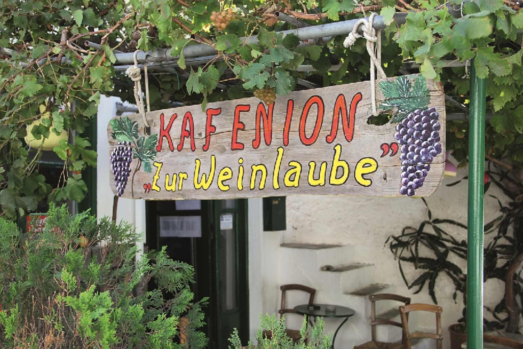 In Pefki das Kafenion „Zur Weinlaube", in dem der lokale Landwein vom Fass probiert werden kann.