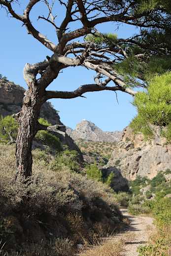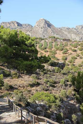 Der breite Weg steigt an der westlichen Schluchtseite zu einer weiteren Gabelung auf, an der ein hellblauer Hydrant, 212 m, steht. Hier wenden wir uns scharf nach rechts (Wegzeichen). Wir wandern nun wieder nordwärts und genießen dabei den Panoramablick auf den Afendis Stavromenos. Der Schotterweg wird bald zu einem gepflasterten Pfad. Dieser steigt in engen Kehren weiter an der westlichen Schluchtseite auf.