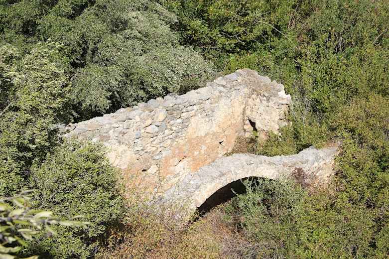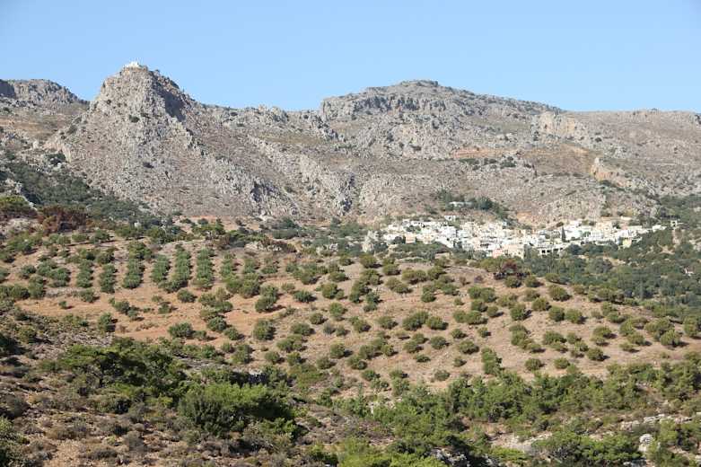 Nach knapp 10 Minuten mündet der Pfad in einen Feldweg. Zurück bietet sich eine reizende Aussicht auf Pefki, das vom Afendis Stavromenos mit Gipfelkapelle überragt wird. Halb linkshaltend erreichen wir auf dem Feldweg 3 Minuten darauf an einem Brunnen und einer Picknickbank die verfallenen Mauern von Milos, 313 m, das Aquädukt der alten Wassermühle ist noch gut erhalten. Wir wandern auf dem Feldweg weiter abwärts.
