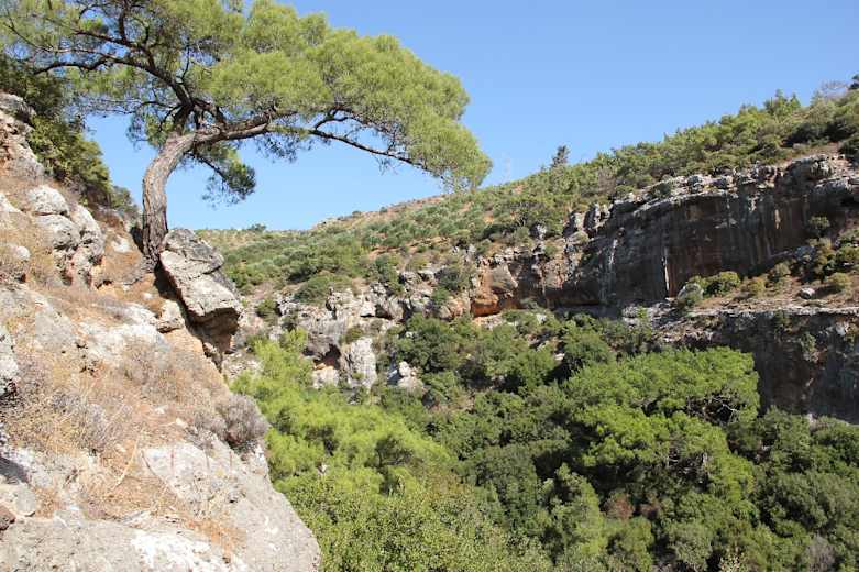Am oberen Schluchtrand angekommen bieten sich Ausblicke auf die östliche Schluchtwand und auf das von Olivenhainen umgebene Pefki. Der Pfad führt ein Stück direkt an der mit einem Geländer gesicherten Abbruchkante entlang und trifft schließlich an dem Brunnen wieder auf den Hinweg. Von dort kehren wir auf bekanntem Weg nach Pefki zurück.