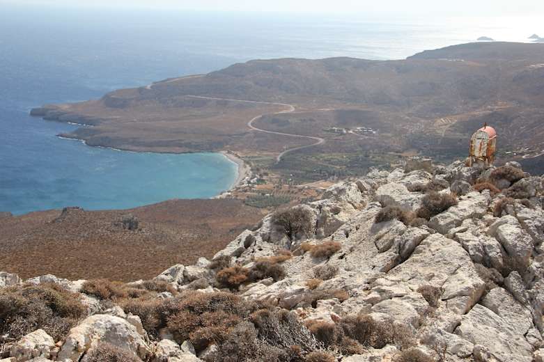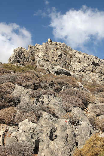 Dann geht es ein paar Minuten über eine Hochfläche und bald wieder steiler in Richtung eines Felskopfes, der an der rechten Seite passiert wird. Über uns baut sich der felsige Rücken des Lakomata mit zwei höckerartigen Gipfelhöhen auf, die rechte ist der Skopeli, 395 m. Die Gipfelsäule dicht neben einer Miniaturkirche erreichen wir gut 10 Minuten später. Aus knapp 400 m Höhe haben wir einen tollen Panoramablick auf Bucht und Strand von Kato Zakros und die umliegenden Küstenberge. Nach dem Gipfelbesuch folgen wir den Wegzeichen weiter nach Norden über eine baumlose, nur von Phrygana bewachsene breite Hochfläche auf den Traostalos zu.