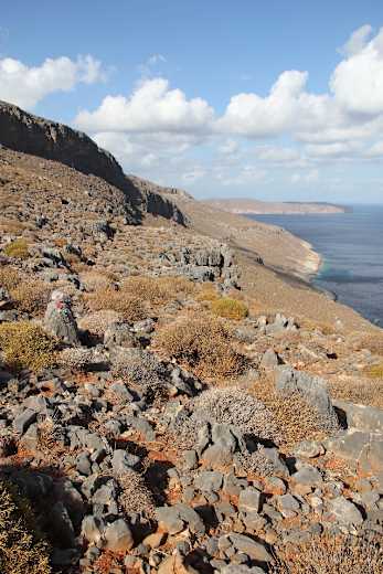 Ein Zickzackpfad führt uns im einfallenden Tageslicht etwa 30 m tief in die Höhle hinab, dort haben Archäologen ihre Spuren hinterlassen. Von der Höhle aus folgen wir nun dem gut ausgebauten Küstenpfad nach Süden. Dieser zieht die ersten Minuten relativ steil am Fuß mächtiger Felswände abwärts und dann in leichtem Auf und Ab gut 30 Höhenmeter über dem Wasser durch teils wie von Riesenhand hingestreute große Felsblöcke. Etwa eine Stunde nach der Höhle queren wir die kleine Schlucht des Kakos Potamos, 37 m. Vor dem Ortseingang von Kato Zakros wandern wir nach einem Gatter, nun auf breitem Weg, an zwei kleinen Kieselbuchten und dem Bootsanleger vorbei zur Uferpromenade zurück.
