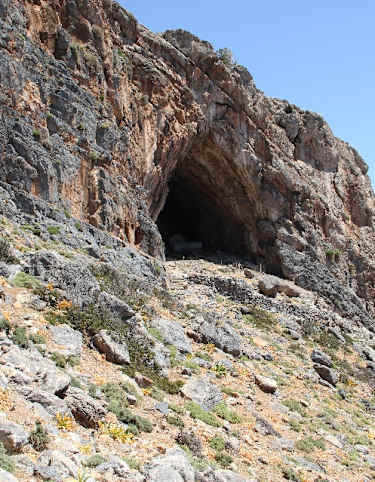 Nach einer Hangterrasse setzt sich dann der teils steile Abstieg durch Felsen fort, bis nach zwei weiteren, von Igelpolsterheide in Beschlag genommenen flacheren Terrassen ein gut ausgetretener Küstenpfad in Sicht kommt. Noch bevor wir diesen erreichen, folgen wir leicht linkshaltend weiter den roten Markierungen direkt bis zum Eingang der Pelekita-Höhle, 103 m. Der einst mächtige Feigenbaum davor hat das Zeitliche gesegnet, doch vielleicht kann sich einer der neuen Triebe durchsetzen.