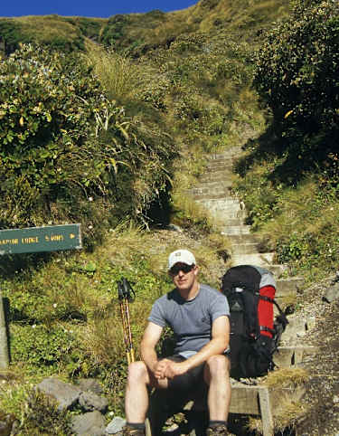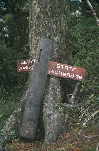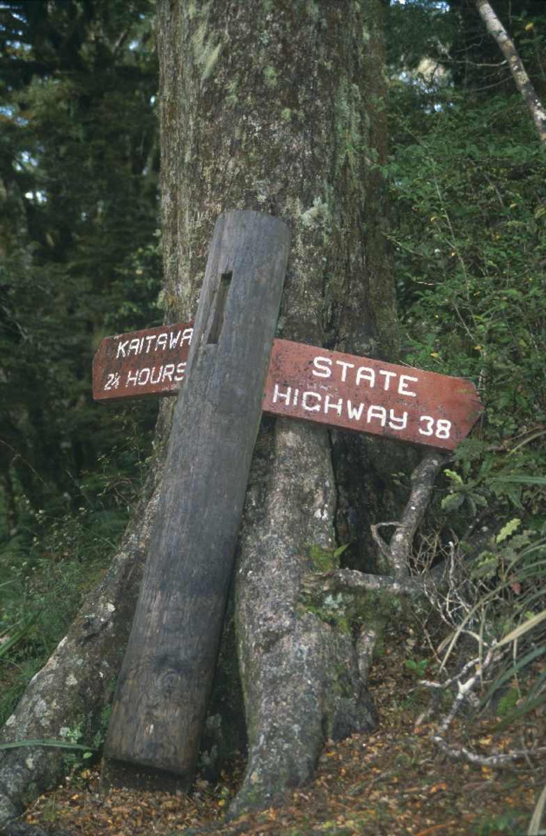 Von hier können wir auch schon den Gipfel (Vermessungsstation und Sendemast) des Mount Ngamoko erkennen. Wir überqueren den SH 38 und folgen dem gegenüberliegenden Pfad des „Ngamoko Track" bergan, der uns in den dichten Wald hineinführt. Am Wegesrand informieren uns Schilder über die in diesem Waldstück vorkommenden Baumarten. An den kurz darauf folgenden zwei Linksabzweigungen zum „Tawa Loop Track" gehen wir geradeaus weiter und gelangen nach insgesamt 35 Minuten an eine Rechtsbiegung (730 m).