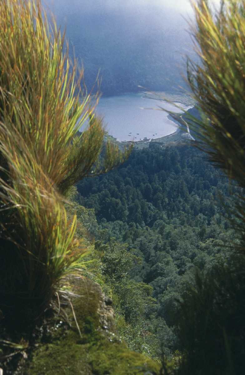 Vom Parkplatz (600 m) am Waikaremoana Motor Camp gehen wir über den Campingplatz. Links hinter den Sanitäranlagen beginnt der „Hinau Track", der uns durch einen kleinen Farn- und Buchenwald in 15 Minuten zum Whaitiri Point bringt (an allen Abzweigungen geradeaus halten). An diesem Platz, an dem sich heute Picknicktische befinden, stand 1900 das erste Hotel des Sees.