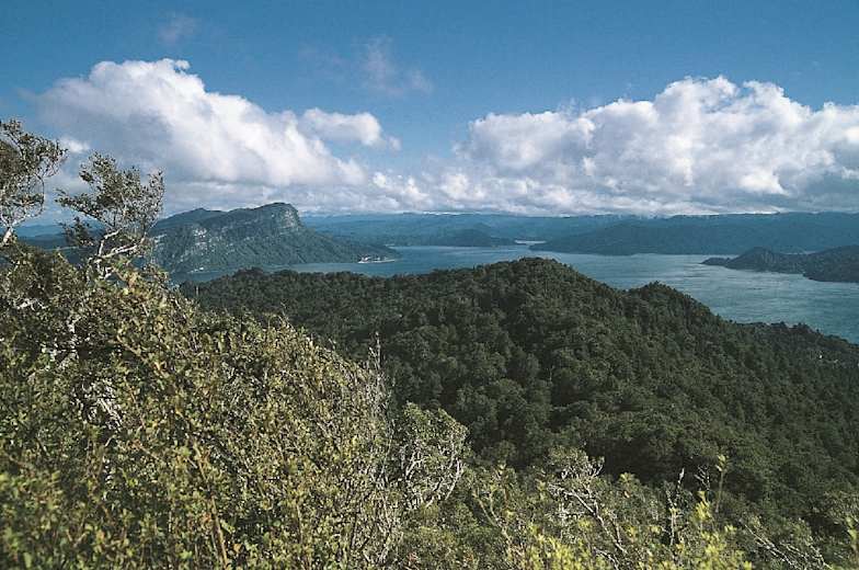 Der Gipfel des Mount Ngamoko (1.099 m) liegt unterhalb der Baumgrenze; durch die Lücken zwischen den Bäumen fangen wir jedoch immer wieder herrliche Blicke über Lake Waikaremoana, die Panekiri Bluffs und unseren Ausgangspunkt ein: den Campingplatz und die in der Bucht liegenden Boote. Bei gutem Wetter reicht der Blick bis weit über die grünen Hügel hinweg. Auf der anderen Seite erstreckt sich weites Farmland in Richtung Gisborne und Wairoa. Auf demselben Weg gehen wir schließlich in 1:45 Stunden wieder zurück zum Parkplatz.