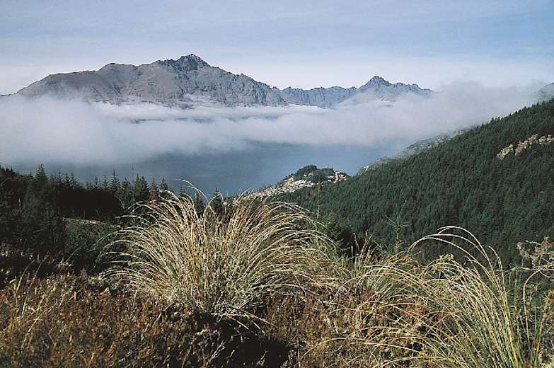 An der kurz darauf folgenden Abzweigung, die rechts zur Gondola führt, gehen wir geradeaus weiter („Ben Lomond Summit"). Der Pfad steigt in sanften Kehren entlang den grasbewachsenen Tussockhängen an, immer mit Blick auf die waldbestandenen Hänge unter uns und auf den tiefblauen Lake Wakatipu, links im Tal rauscht der One Mile Creek. Mehrere ausgetretene Pfade führen auf den rechts von uns liegenden Kamm hinauf – ein kurzer Abstecher (nach gut 1:45 Std., Steinmännchen) lohnt sich.