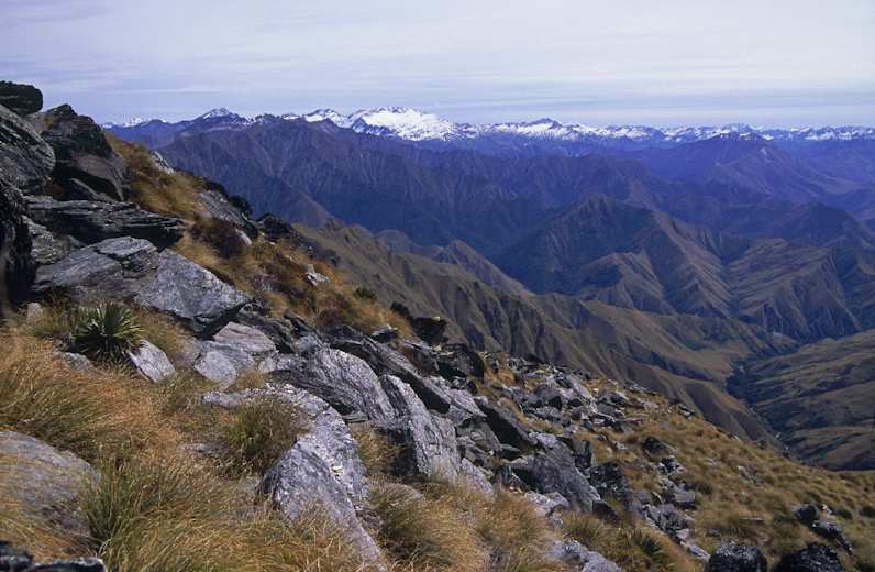Nach insgesamt 2:45 Stunden ist an einer Wegkreuzung der Ben Lomond Saddle (1.316 m) erreicht. Hier am Schild folgen wir dem Pfad nach links zum „Ben Lomond Summit". Kurz hinter dem Sattel werden wir mit einem unerwarteten, wunderbar weiten Blick auf die vergletscherten Gipfel des Mt.-Aspiring-Nationalparks überrascht. Der nun folgende einstündige Gipfelanstieg ist sehr steil und in kurzen Passagen ausgesetzt.