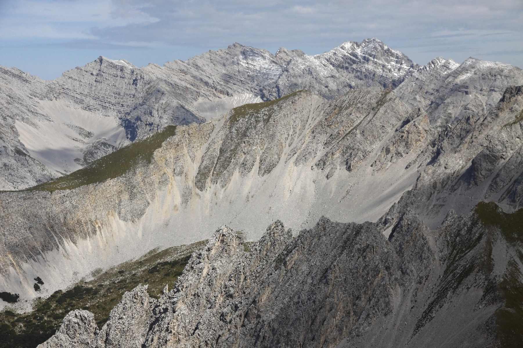 Faszinierend die Stadttopografie aus der Vogelschau und ihre Einbettung in die große Alpenlandschaft. Da wird die Relation zwischen Menschenwerk und Natur doch gleich einmal deutlicher. Wir berühren am Goetheweg mehrere Schärtchen, wodurch sich immer wieder Perspektivwechsel ergeben. Bei der Pfeishütte wähnt man sich bereits im Inneren des Karwendels, umrahmt von stattlichen Gipfeln.