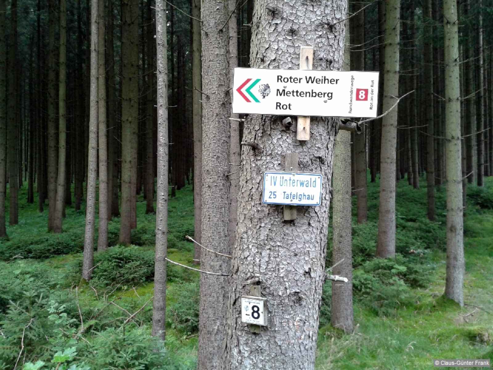 Hier gehen wir nach links in den Wald, die Markierungen sind an dieser Stelle nicht klar. Nach ca. 3 Min. wandern wir bei der ersten Möglichkeit nach rechts, verlassen nach gut 100 m den Wald und laufen am Waldrand geradeaus weiter, anfangs ohne deutlichen Pfad. Wo der Waldrand endet, führt der Weg geradeaus in ein kleines Tal, dort vor Bäumen und Büschen nach rechts und danach nach links. Bei einer Wegspinne folgen wir dem asphaltierten Weg nach rechts in das nahe Mettenberg. Nach den ersten Höfen erreichen wir den Eichenberger Weg. Der Weg 8 führt nach rechts, wir wandern aber nach links und bei der nächsten T-Kreuzung kurz darauf nochmals. Wir befinden uns jetzt auf dem Weg 8a, allerdings entgegen der Markierungsrichtung. Gut 5 Min. nach der Bebauungsgrenze steht rechts vom Weg ein einzelner Baum.
