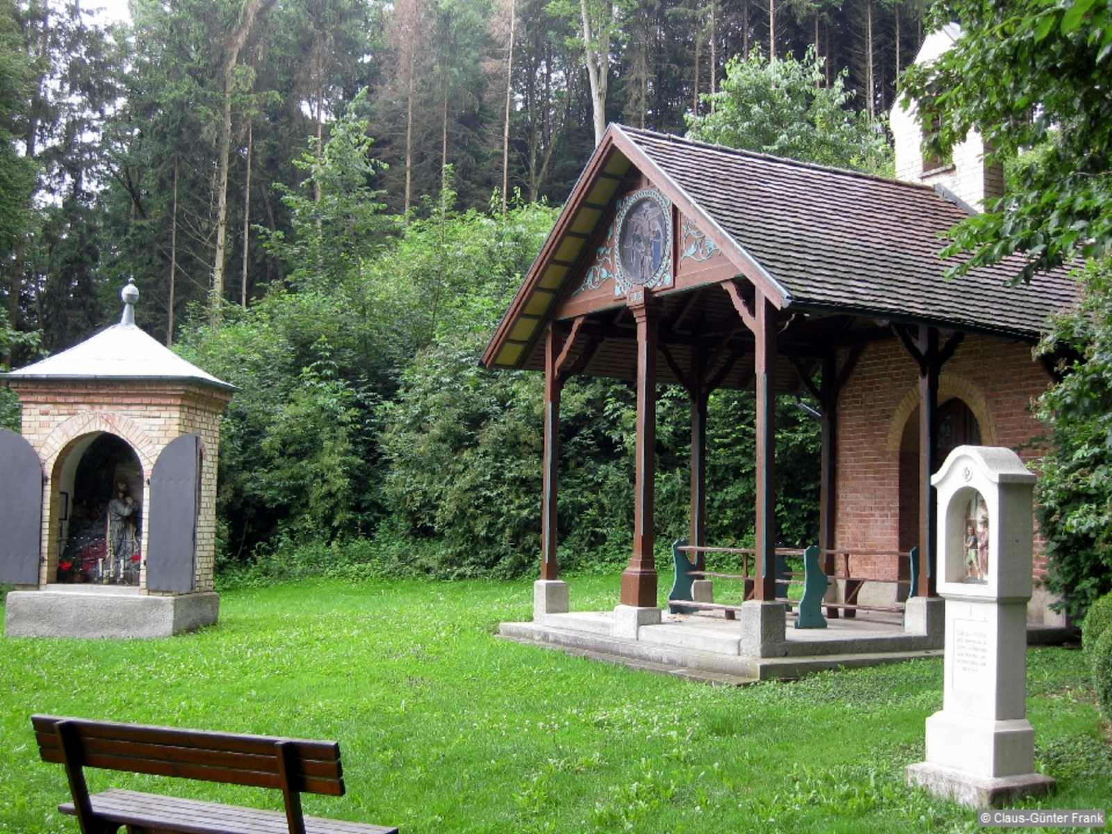Vom Gasthaus zur Linde in Rot an der Rot gehen wir in der Klosterstraße zur Einmündung in die Ochsenhauser Straße und dann nach rechts, ortsauswärts. Die Landstraße überquert die Rot und macht dann, kurz vor dem Waldrand, eine Rechtskurve. Hier biegen wir nach links und gleich wieder nach rechts zu der Handvoll Häuser von Ziegelhütte. Der Weg verläuft anfangs parallel zur Landstraße und wendet sich dann nach links in den Wald. Wir folgen diesem Weg geradeaus, auch bei einer Kreuzung am Ende des Anstiegs. Bei einer Gabelung gleich danach gehen wir rechts und dann über ein Wildgatter in den umzäunten Wald.