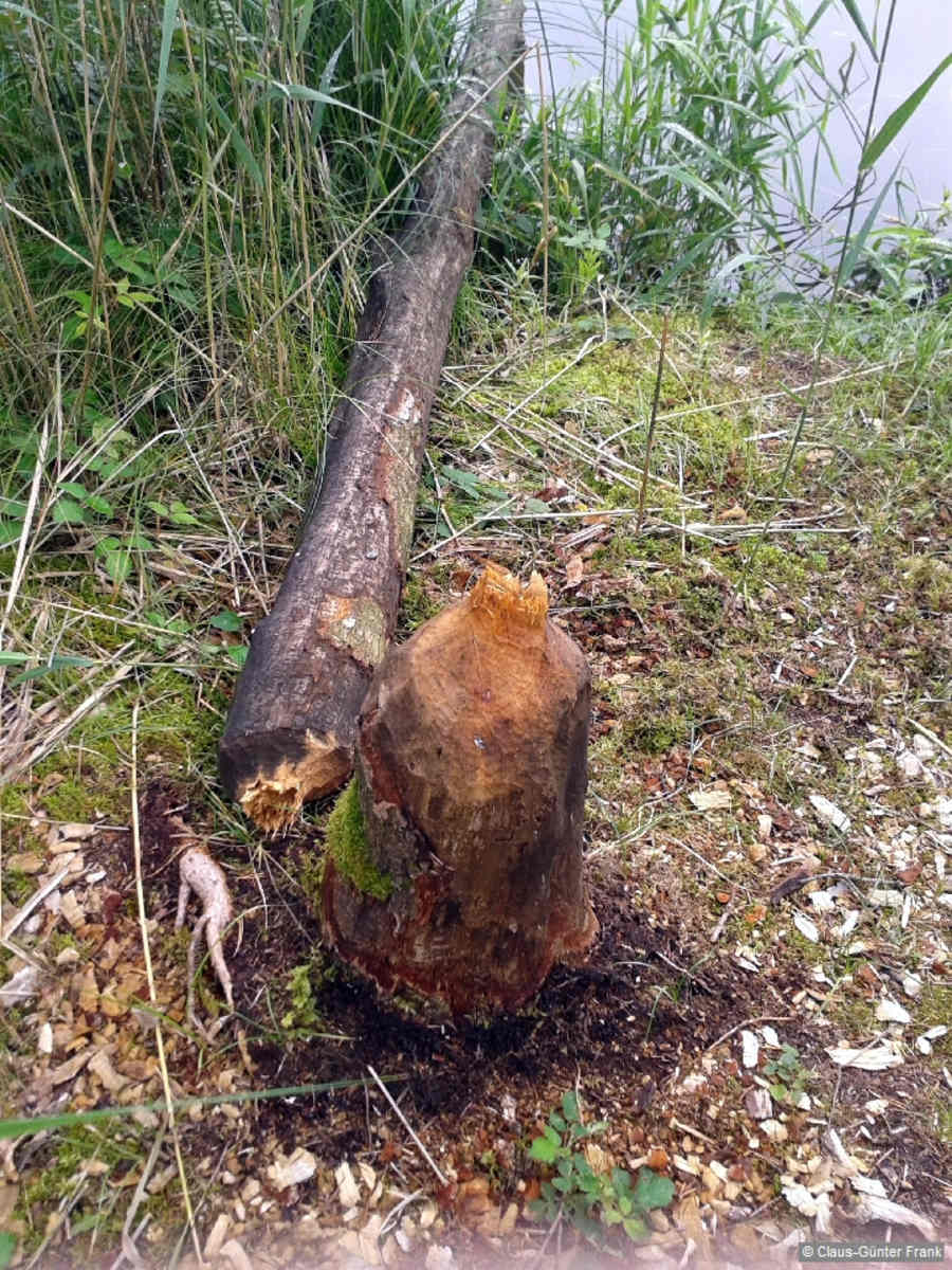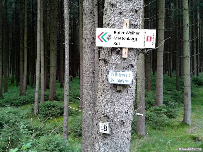 Bei der folgenden Gabelung halten wir uns links und gehen dann immer geradeaus, bis wir bei einem zweiten Wildgatter den umzäunten Wald verlassen. Bei der T-Kreuzung nach dem Reichenbach wandern wir nach rechts am Waldrand entlang, bis knapp 5 Min. später nach einer Linkskurve die Landstraße sichtbar wird. Beim zweiten Abzweig folgen wir dem Wegweiser nach links in den Wald. Bei der ersten Kreuzung wandern wir geradeaus, bei der zweiten Kreuzung ebenfalls (hier leitet die Markierung mit dem blauen Balken nach links) und bei der dritten biegen wir nach rechts. Der Weg führt zur Landstraße, wir gehen auf ihr gut 100 m nach rechts, dann nach links in den Wald und nach einer rot-weißen Schranke nochmals links. Nach 5 Min. auf dem geraden, breiten Weg liegt links ein Hochstand. 30 m danach folgen wir einem schmalen Pfad nach links in den Wald. Der Wegweiser ist ungeschickt angebracht und leicht zu übersehen. Der Pfad wird bald besser und führt am Ufer des Roter Weihers entlang. Umgestürzte Bäume lassen erkennen, dass im See Biber heimisch sind. Nahe am Ende des Weihers ist ein Grundstück eingezäunt, wir gehen deshalb in ca. 30 m Abstand zum Wasser weiter am Ufer entlang. Am Ende des Weihers halten wir uns rechts, dann führt der breite Weg im Wald immer geradeaus, bis wir nach etwa 15 Min. eine T-Kreuzung erreichen.