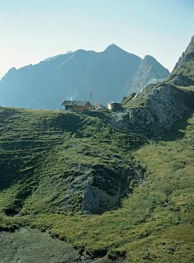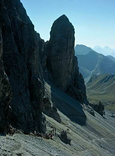 Zum Hintersattel schlängelt sich der Steig in mehreren Kehren empor (1:15 Std., Tafel). Der Übergang schmiegt sich eng an den Fels der Königswand, die auf mittelsteiler Halde ostseitig umgangen wird.