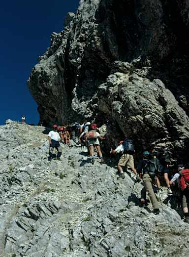 Zur Linken wirkt die lange Liköfelwand wesentlich schmächtiger. Im von Bergsturztrümmern übersäten oberen Talbereich weist eine Tafel zur mächtigen Nordwand der Großen Kinigat und zum 650 m langen Klettersteig. Mit einer Länge von 400 Hm und der Schwierigkeit C bleibt er nur sehr erfahrenen Bergsteigern vorbehalten.