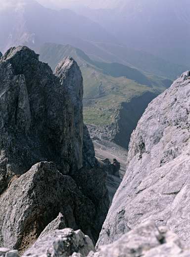 Gleichmäßig steigend durchmisst ein Pfad die im Sommer mit gelbem Alpenmohn gezierte Halde und nähert sich der schmalen Felsrampe, die den Aufstieg zum Gipfel vermittelt. Ein Stahlseil ist an dieser felsigen und mit etwas Vorsicht zu begehenden Stelle hilfreich. Ohne Problem erreichen wir das nach Norden geneigte große Gipfelkar mit Resten ehemaliger Kriegsstellungen. Nur 10 Min. entfernt steht das Friedenskreuz (Europakreuz) auf der Großen Kinigat.