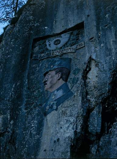 Spürbar steiler windet sich der vom Österreichischen Pionierbataillon 7 erbaute Weg in Kehren bergan. Der Sprudelbach und der über Felsen stürzende Hildenfall lassen das Tal vom Brausen beben. Das schäumende Wasser bestaunen wir von einer Brücke aus, wo eine Gedenktafel an ein Unglück erinnert und ein monumentales Wandbildnis dem K. K. Feldjägerbataillon 1915/16 gewidmet ist.