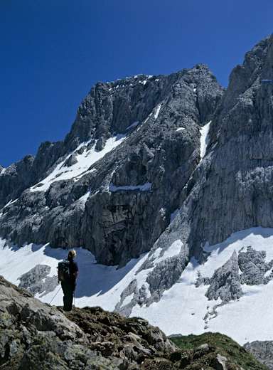 Vor dem Abstieg (3:30 Std.) auf demselben Weg sehen wir uns ausgiebig um: Mit Wucht und einmaliger Schönheit ragen links und jenseits des Wolayertales die Kellerwand, der Kellerwandturm und, direkt vor uns, als riesiger Kalkblock die Hohe Warte auf (mit 2.780 m höchster Gipfel des Karnischen Kammes). Zur Rechten schließt mit pyramidenförmigem Aufbau der Seekopf an. Mittelpunkt dieser herrlichen Bergszenerie ist der tiefblau schimmernde Wolayersee.