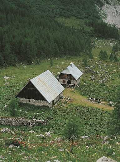 Nach weiteren Wegkehren erreichen wir die grüne, wuchsfreundliche Verebnung der Oberen Wolayeralm, 1709 m, mit zwei solide erbauten Almhäusern unter spitzgiebeligen Blechdächern. Die in einen Bergkessel gebettete Hochalm wird von einem Latschengürtel umgrenzt und von Felsmauern umbaut. Noch vier Wegschleifen gilt es anzusteigen, ehe wir in den nächsten kleinen Bergtrog eintreten.