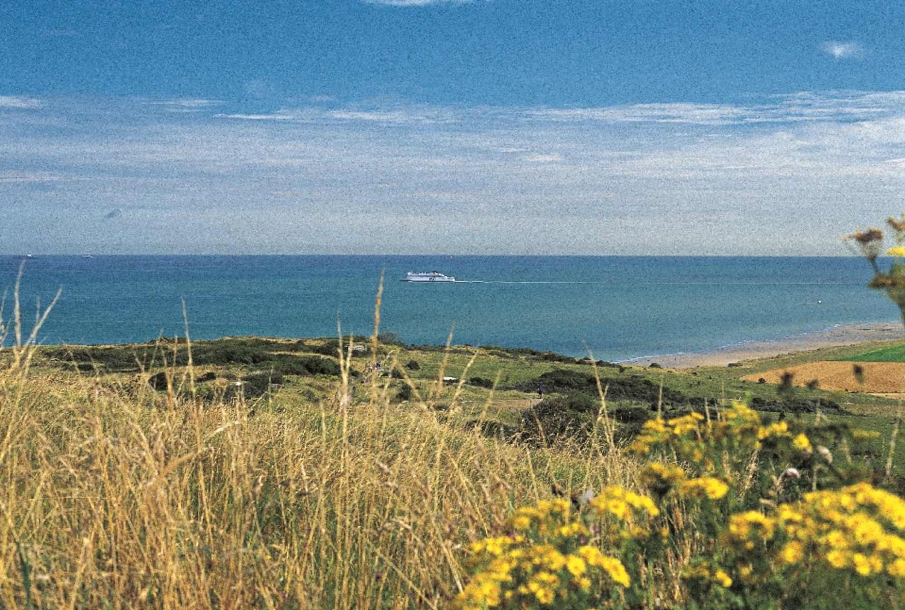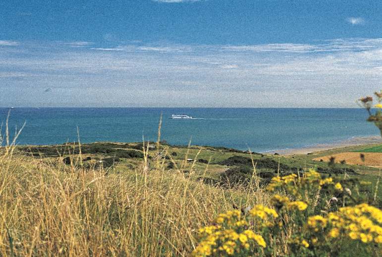 Vom Parkplatz Cran d’Escalles nehmen wir gleich den GR in nördlicher Richtung steil bergauf. Schon bald ist jedoch der ursprüngliche Weg an der Küste wegen der Gefahr von Felsrutschungen gesperrt und wir müssen nach rechts den Hang queren, bis es wieder nach Norden kräftig und weiterhin aussichtsreich bergauf geht. Am Monument für die im 1. Weltkrieg gefallenen Seeleute erreichen wir nach 25 Minuten mit 158 m unseren höchsten Punkt am Cap Blanc Nez, der eine herrliche Aussicht ins Landesinnere und über die Küste bis England bietet. Der Zugang zu den Klippen des Kaps ist aus Gründen der Sicherheit und des Naturschutzes verboten.