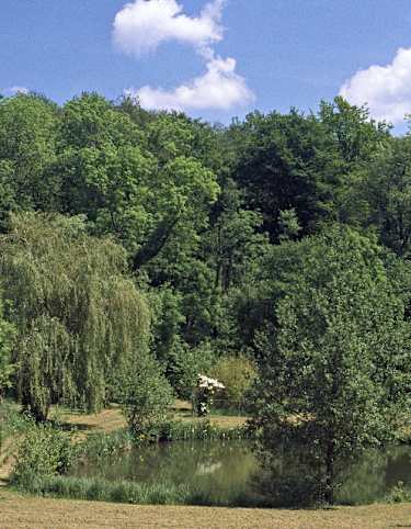 Noch immer auf Kopfsteinpflaster wandern wir an Seen, feuchten Wiesen, Sümpfen oder Schilfzonen vorbei. Unterwegs mündet von links der GR ein, zweigt aber schon bald nach einem See beim Asphaltbeginn nach rechts ab. Hier können wir der alten Wegführung geradeaus auf Teer weiterfolgen und vor einem Bach links auf ein schmales Teersträßchen abbiegen. Interessanter aber ist es, ein paar Meter nach der Abzweigung des GR den Weg links über einen Bach (Brücke) zu nehmen. Wir achten dabei stets auf unsere gelben oder gelb-roten Markierungen bzw. die Tafeln „Circuit de la Canarderie".