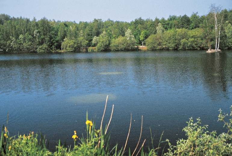 Der Pfad führt in südwestlicher Richtung am Fuß von neu bepflanzten Abraumhalden mit vielen Birken, Heckenrosen und Kaninchen vorbei. Nach ca. 500 Metern dürfen wir an einer Verzweigung nicht den ersten Weg spitzwinkelig nach rechts nehmen, der wieder zurückführt, sondern den zweiten mit gelben Zeichen, der uns leicht bergauf und bergab zum Étang de la Digue Noire bringt. Nach einer Rechts- und einer Linkskurve wandern wir zwischen ihm und dem Étang du Moulineau hindurch und können viele der hier lebenden Vögel beobachten.