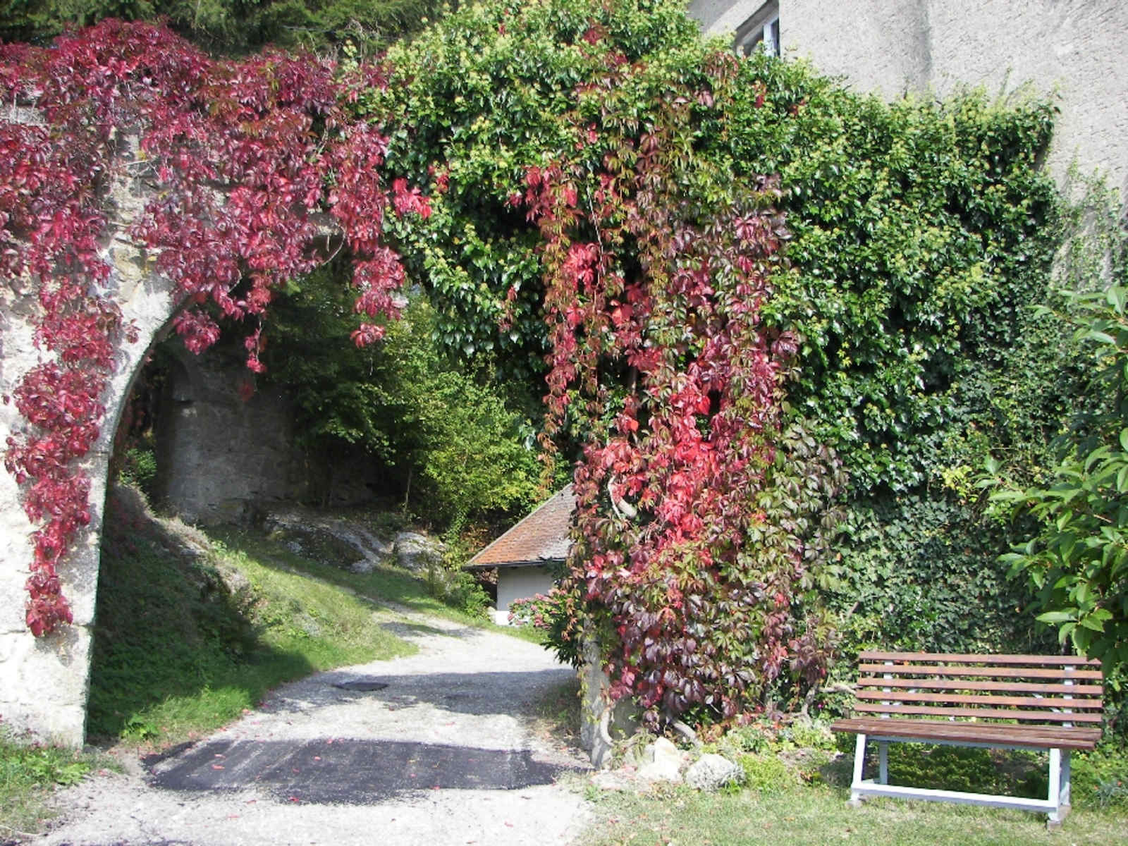 Wir verlassen die Burg, indem wir vom Aussichtsturm kommend vor dem Torbogen links über die Steinstufen zu einer Wiese absteigen. Wir überqueren diese nach links, schreiten durch die beiden Burgtore und gehen den Staufferweg hinab. Mit dem grünen Rechteck links Richtung Dosmühle. Mit weitem Blick über die hügelige Landschaft erst auf der Straße Richtung Berndorf, dann links einen Feldweg hinab nach Wernetsgrub.