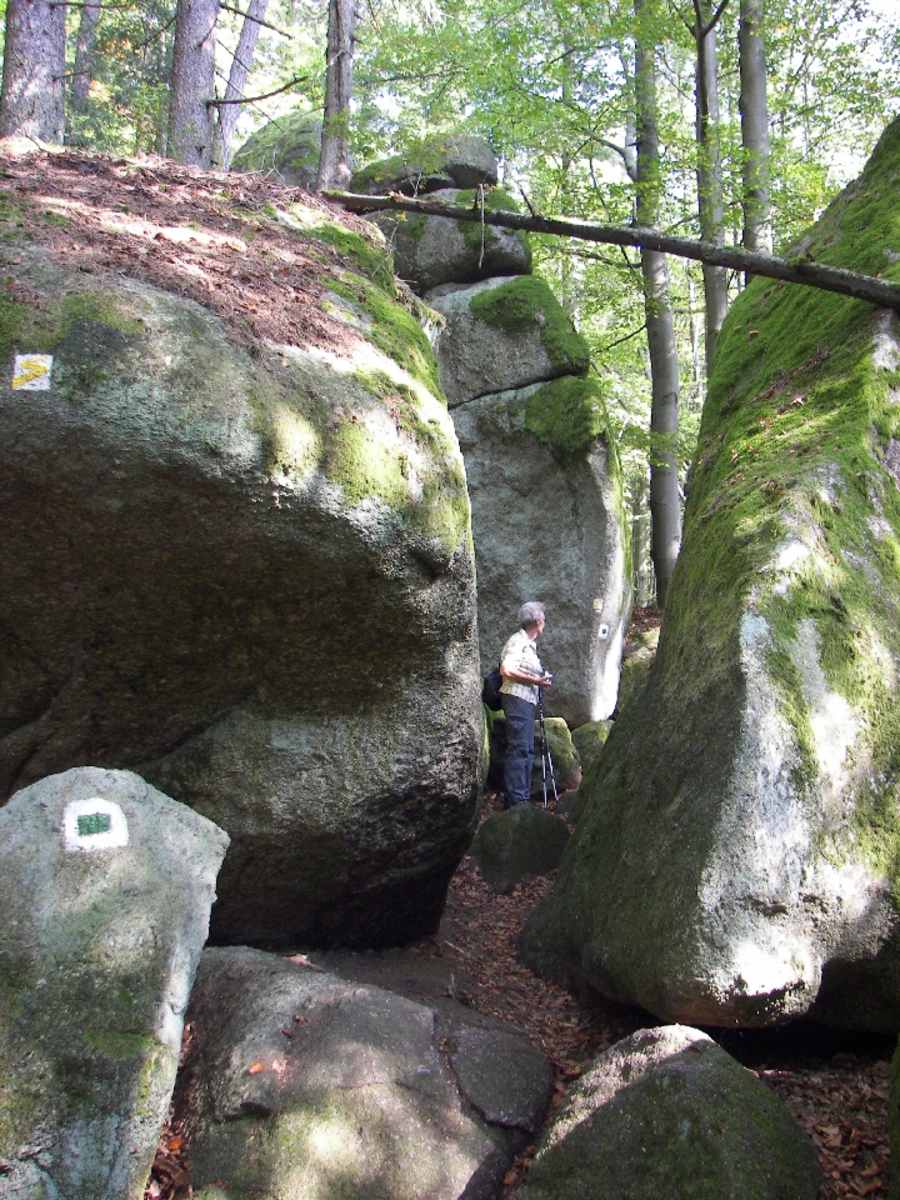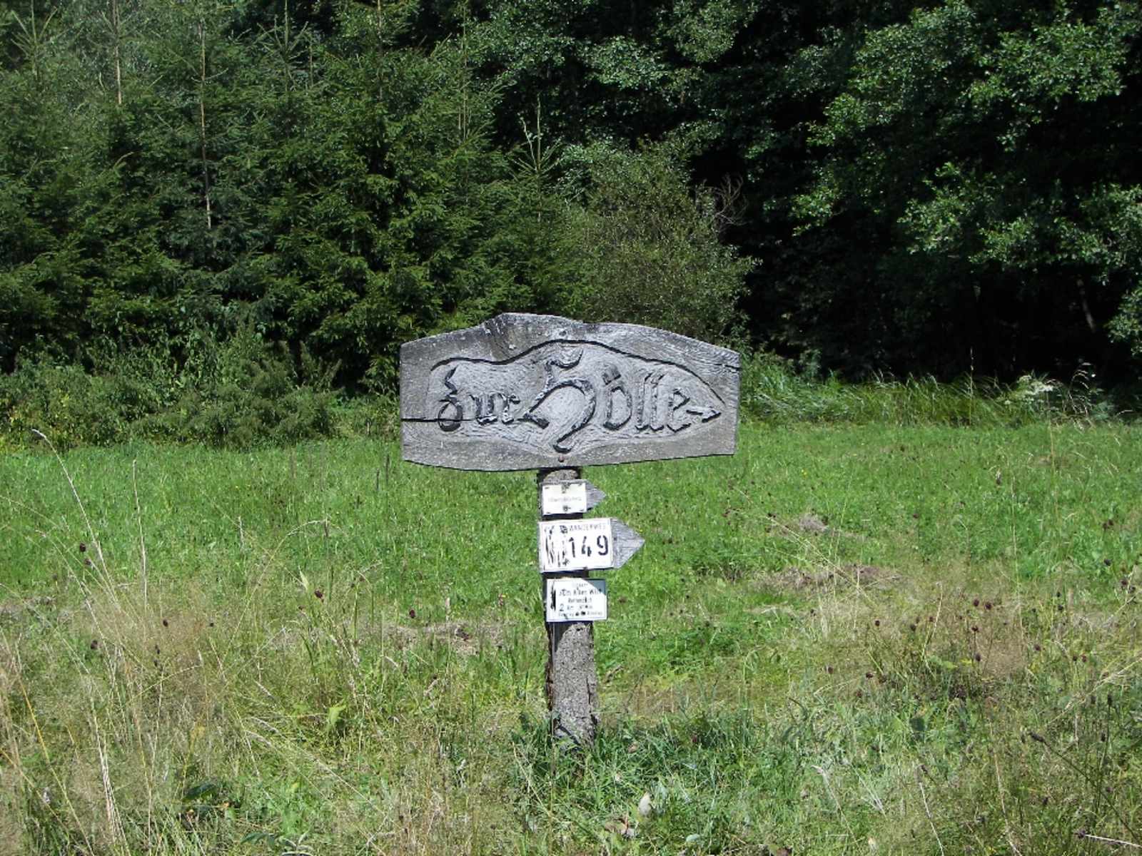 Mehrmals windet sich unser gut markierter Uferpfad durch die Felsgiganten im Naturschutzgebiet Höllbachtal. Es wird ruhiger und kurz darauf gehen wir rechts über die Brücke und links den Schotterweg bergan zu einer Wandertafel. Hier folgen wir dem Höllbachweg 149 und den roten „Rundweg Hölle“-Schildern auf dem Sträßchen nach rechts.