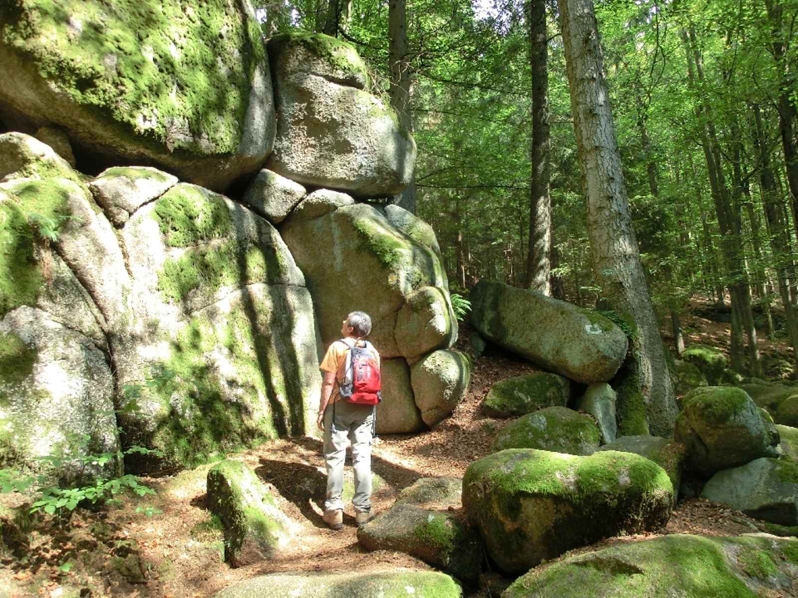 Im mystisch wirkenden Naturschutzgebiet Höllbachtal schlängelt sich dunkel, kühl und eindrucksvoll der Höllbach durch ein Meer aus moosbedeckten Felskolossen. Wollsackverwitterte Granitblöcke türmen sich links und rechts des Weges, das Wasser rauscht über kleine Wasserfälle – ein Naturerlebnis voller Abwechslung und Kontraste.