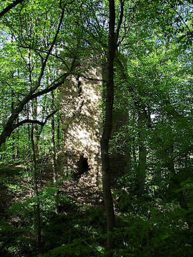 Auf dem Alleeweg verlassen wir mit dem grünen Rechteck Karlstein und genießen noch einmal den hübschen Blick zurück auf das Schloss. Wir folgen dem Höhenrücken, bis der Feldweg in einen Wiesenweg übergeht. Unmittelbar zuvor gehen wir auf einem kleinen, unmarkierten Waldweg nach rechts und folgen der Rechtskurve, dann biegt ein Pfad links zur Ruine Forstenberg ab.