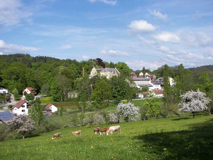 An der Straße gehen wir links und erreichen in wenigen Minuten Karlstein. Am Dorfweiher biegt links mit dem grünen Rechteck unser Weiterweg ab. Zuvor lassen wir uns jedoch eine verdiente Stärkung im Gasthaus Lautenschlager und eine äußerliche Besichtigung des neugotischen Schlosses Karlstein gleich hinter dem Gasthaus nicht entgehen.