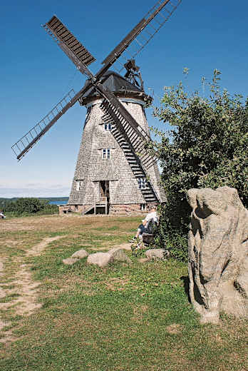 Wir folgen der Hauptstraße in den Ort, halten uns an der ersten Abzweigung rechts und gelangen zur sehenswerten Kirche aus dem 13. Jahrhundert. Auf der Kirchstraße kommen wir links zur Hauptstraße zurück, wo wir geradeaus zu einem Parkplatz und dann links auf einem Fußweg hinauf zu einer Holländerwindmühle gehen, die besichtigt werden kann. Von hier haben wir einen schönen Blick zurück auf den Schmollensee.