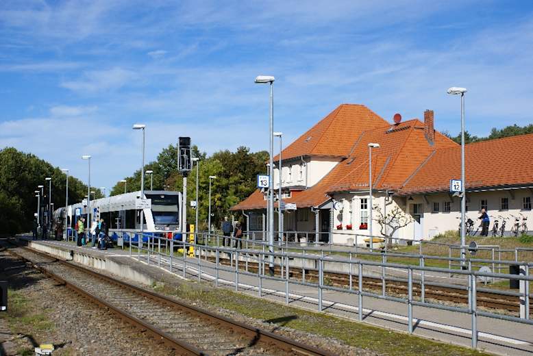 An der Gabelung in der Ortsmitte folgen wir rechts dem Wegweiser zum Aussichtsturm Sieben-Seen-Blick auf dem Krückenberg (40 m). Von der Plattform aus kann man die namensgebenden sieben „Seen“ sehen: Krebssee, Gothen- und Schmollensee, Achterwasser, Stettiner Haff, Kachliner See und die Ostsee. Wenige Schritte hinter dem Aussichtsturm verläuft die Benzer Chaussee, auf der wir links in 20 Minuten zum Bahnhof Bansin zurückgehen.