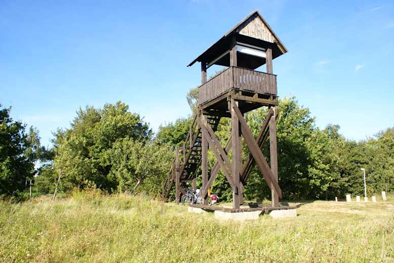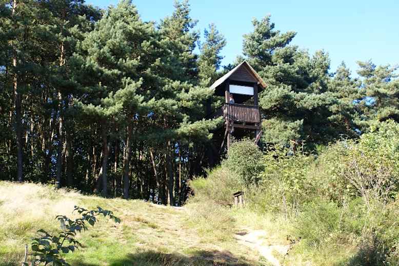 Hinter der Mühle halten wir uns zunächst links und umrunden auf einem Feldweg den Reitplatz. Am Waldrand gehen wir rechts zu einer Straße, der wir auf einem Fußweg auf der linken Straßenseite aus dem Ort hinaus folgen. Schon nach wenigen Minuten lassen wir die Straße hinter uns und wandern schräg links durch ein kleines Wäldchen und über Felder auf den bewaldeten Kückelsberg, 58 m. Wo der Weg den Wald verlässt, befindet sich ein Aussichtsturm, von dem aus man einen schönen Blick über den Gothensee und das 16 km² große Niedermoor Thurbruch hinweg zum Stettiner Haff hat. In der Ferne kann man die Steilufer der Insel Wollin erkennen.