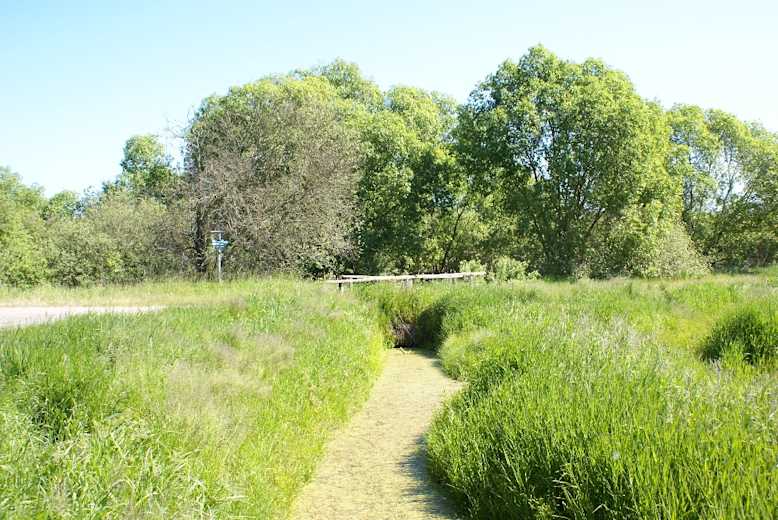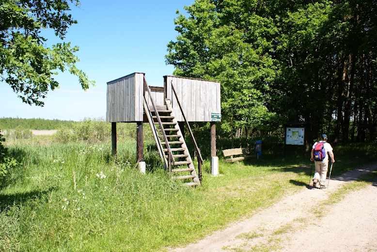 Dahinter gehen wir nach links und treffen, nachdem wir den Graben ein weiteres Mal überquert haben, auf einen Naturbeobachtungsturm. Eine Tafel informiert uns über die Entstehung sowie die Flora und Fauna auf dem Gebiet des verlandenden Eggesiner Sees.
