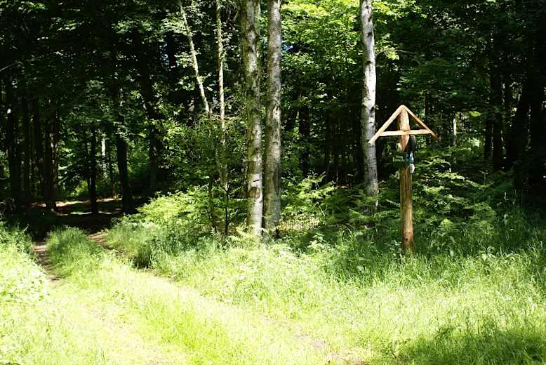 Der markierte Wanderweg biegt links ab, führt nach fünf Minuten aus dem Wald hinaus und über den Hammergraben. Dahinter geht es wieder in den Wald.
