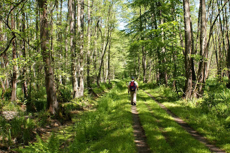 An der ersten Abzweigung biegen wir erneut links ab. Durch schöne Buchenbestände bringt uns das grüne Quadrat zu einem Dammweg, der uns durch ein Erlenbruch leitet. Dahinter schwenkt der Weg nach links.