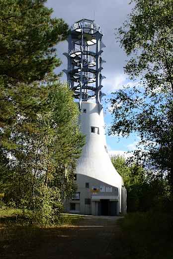 An der Infotafel verlassen wir den Radweg und machen rechts einen kurzen Abstecher zur sogenannten Glocke. Dieser monumentale Bunker diente als Feuerleitturm der Strandbatterie Goeben. 2001 wurde er saniert und zum Waldbrandbeobachtungsturm der Swinemünder Feuerwehr umgebaut. Wenn er in den Sommermonaten besetzt ist, kann man den Turm besteigen. Von oben hat man einen hervorragenden Rundblick über die gesamte Halbinsel Pritter, vom Streckelsberg auf Usedom bis zur Steilküste bei Misdroy und südwärts bis zum Stettiner Haff.