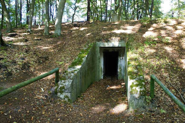 Wenig später erblicken wir links den Zugang zu den unterirdischen Resten der Batterie Liebesseele aus dem Zweiten Weltkrieg. Die Bunkereingänge sind noch gut erhalten.