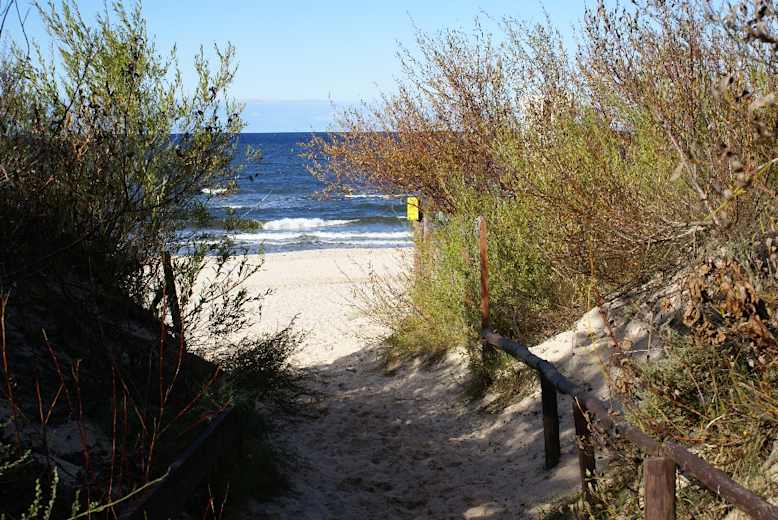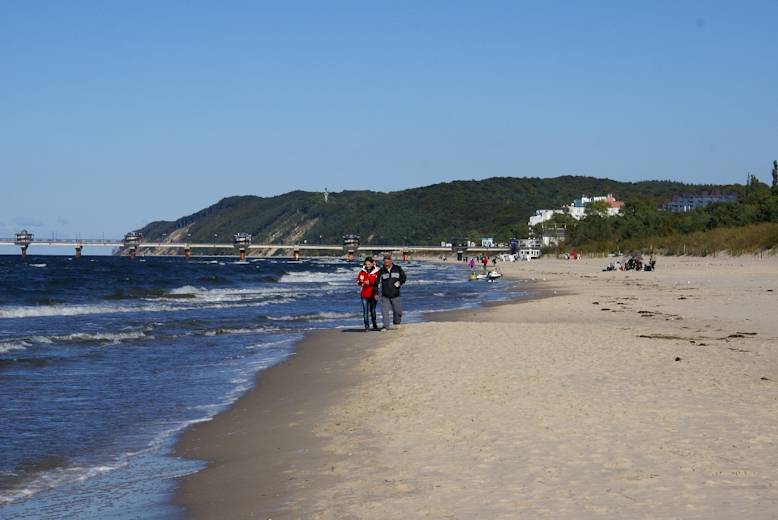 Nachdem wir die Anlagen hinter uns gelassen haben, verlassen wir den markierten Radweg bei der nächsten Möglichkeit und gehen links durch die Dünen zum Strand. Mit schönem Blick auf Misdroy und die dahinter aufragende Steilküste wandern wir vor zur Misdroyer Seebrücke. Hier nehmen wir eine Treppe hinauf zur Strandpromenade, gehen links zum Kurhaus und von dort Wegweisern folgend durch den Chopin-Park zum Plac Neptuna und zur nahen Bushaltestelle an der ul. Niepodległości, wo die Busse der Linie 10 zum Bahnhof Świnoujście (PKP) abfahren.