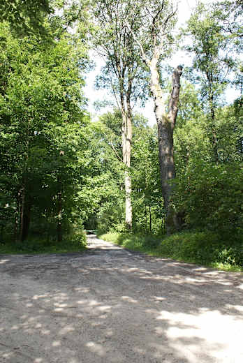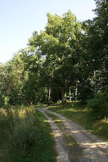 Wir überqueren diesen Weg und anschließend in einer Furt auf Trittsteinen auch den kleinen Wasserlauf. Gleich dahinter steigen wir steil auf das gegenüberliegende Ufer hinauf. Am Rand der Lichtung halten wir uns links, wandern an der unter Denkmalschutz stehenden Stieleiche „Einzelgänger“ (Dąb Samotnik) vorbei und unter einer Stromleitung hindurch.