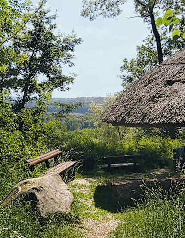 Nach einer Rast geht es über die Brücke und 100 m weiter links auf einem Pfad den Hang hinauf. Der Pfad führt geradeaus zu einer Kreuzung, an der wir ebenfalls geradeaus weitergehen (die Markierung fehlt hier).