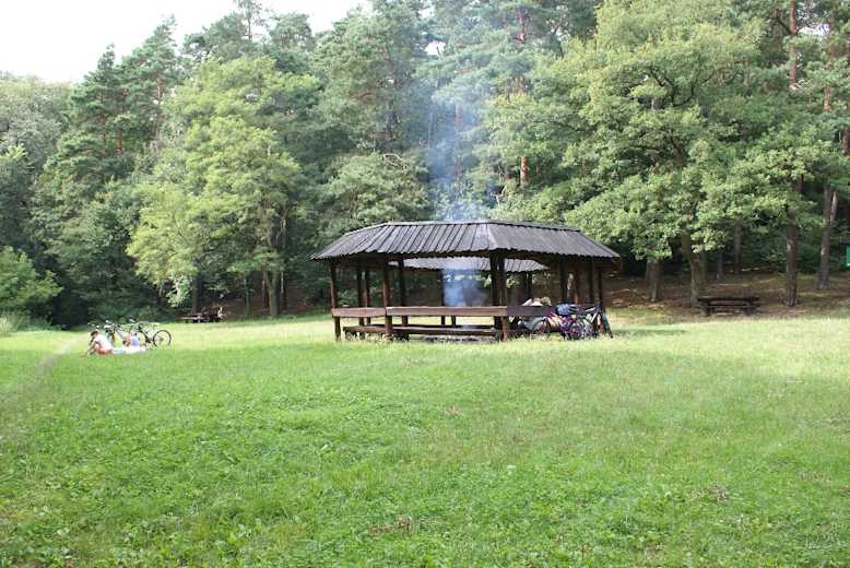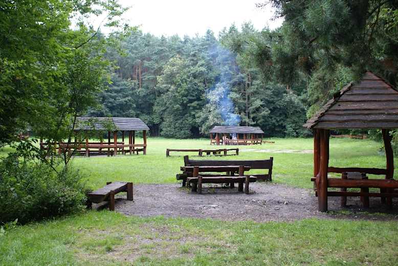 Nach wenigen Minuten führt der markierte Weg wieder über den Bach hinüber und zur Pfadfinderlichtung (Polana Harcerska). Der große Platz mit vielen Grillplätzen und Bänken lädt zur Rast ein. Dahinter führt der mit einem blauen Strich markierte Wanderweg am Rand des Siebenbachmühlentals zu einer Forststraße, auf der wir zunächst weiterlaufen. Links können wir jenseits des Springbachs durch die Bäume ein Gebäude sehen: die ehemalige Kaisermühle. Fünf Minuten später biegen wir links ab, kommen zu einer Kreuzung mit Sendemast, laufen geradeaus zu einem weiteren großen Rastplatz und an einem Teich vorbei zu einer Straße.