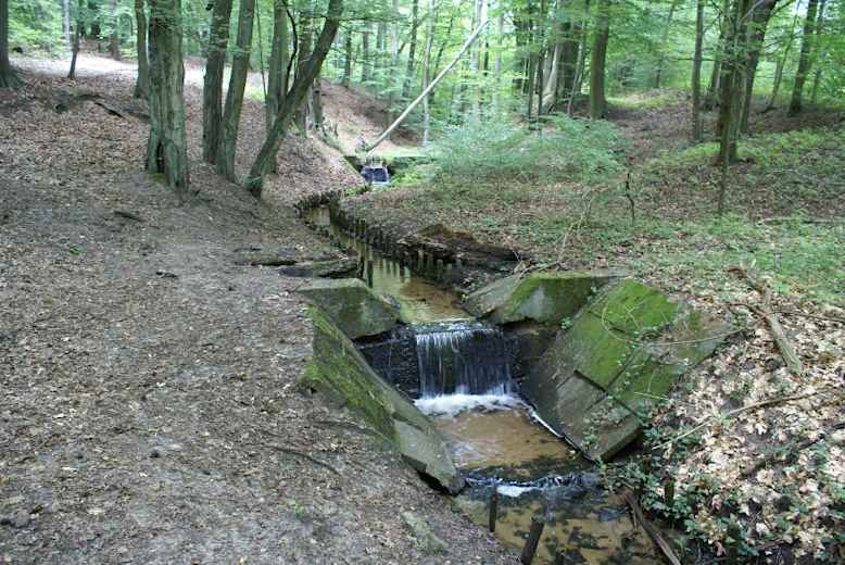 An einem einzelnen Haus auf der gegenüberliegenden Seite queren wir die Straße und betreten an einer Schranke den Wald. Der Weg führt an das Hochufer oberhallb des tief eingeschnittenen Krieklandsbach (Grzybnica) und folgt ihm westwärts durch den Wald.