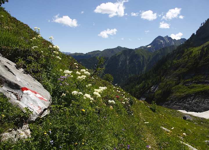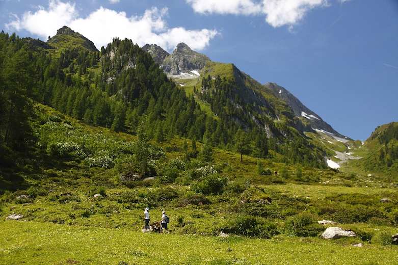 Hier ist man von den Erschließungen des harten Tourismus praktisch abgekapselt, wandert im zeitigen Sommer oberhalb der Weißbachlalmen durch ein purpurrot leuchtendes Meer von Alpenrosen und lässt sich derweil vom mächtigen Bollwerk des Brandberger Kolm fesseln.