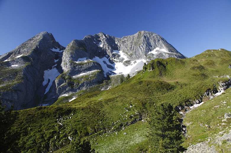 Hier setzt rechts ein Steig ein, dem wir in typisches Alpenrosengelände folgen. Man kommt in ein Hochtälchen voran und zweigt auf gut 2.100 m nach rechts zum Torhelm ab. Mit einer Schleife auf den gutmütigen Ostrücken und meist nur mäßig steil bis auf den begrünten Gipfel des Torhelm, 2.452 m. Zur Fortsetzung gehen wir über den obersten Hang kurz zurück, bis man mit einem scharfen Knick auf markierter Steigspur in die Südseite des Ostrückens hineinqueren kann.
