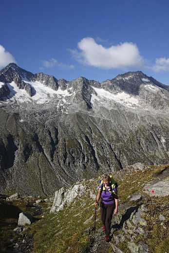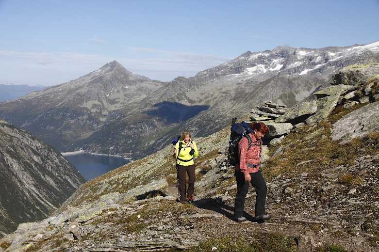 Der Hannemannweg (Nr. 502) beginnt nun in südlicher Richtung und führt horizontal bis geringfügig ansteigend oft als tolle Blocktrasse durch die Hänge. Ab und an mal einen Bach kreuzend, durchquert man das wenig ausgeprägte Hohenaukar sowie das Seekar (Keeskar), wo der Steig über die Zillerplattenscharte links aufwärts und wenige Schritte weiter unsere Abstiegsroute (Nr. 517) rechts abzweigt.