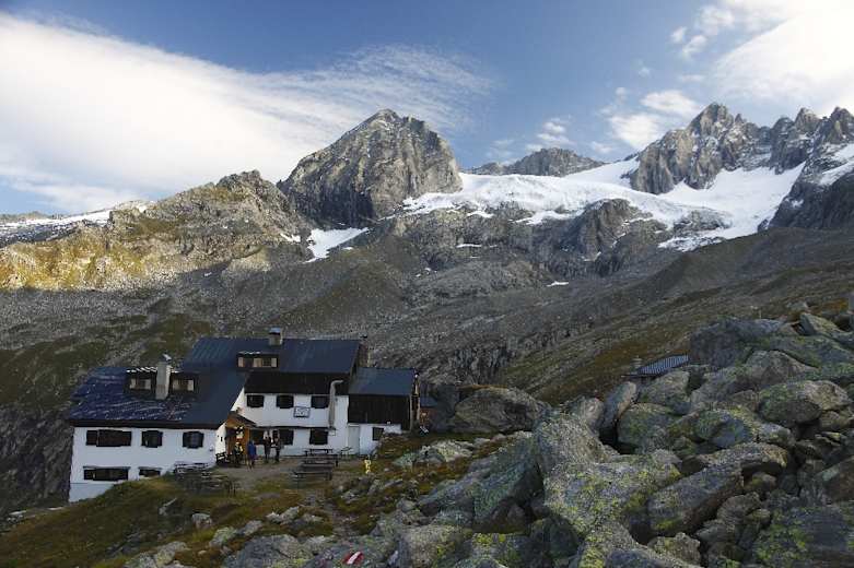 Nach rund 2 Std. empfängt uns die Plauener Hütte, 2.363 m, auf einem Absatz im Kuchelmooskar.