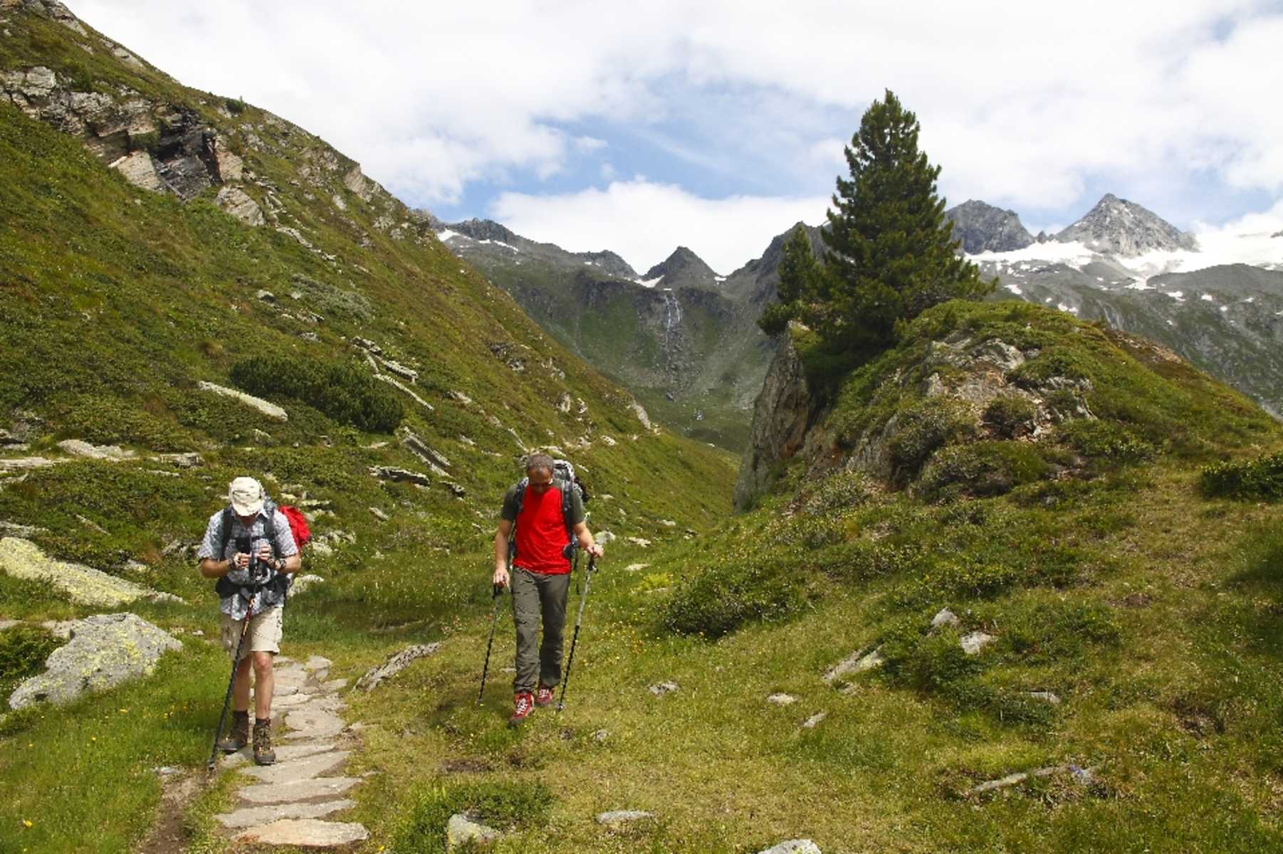 Vom Breitlahner, 1.257 m, begeben wir uns auf den breiten Weg Nr. 523 in den inneren Zemmgrund und erreichen bereits nach kurzer Zeit die kleine Jausenstation der Klausenalm, 1.301 m. Weiter über längere Flachstrecken an der Schwemmalm, 1.350 m, vorbei und danach deutlich ansteigend zur Grawandhütte, 1.636 m, im Angesicht des imposanten Wasserfalls.