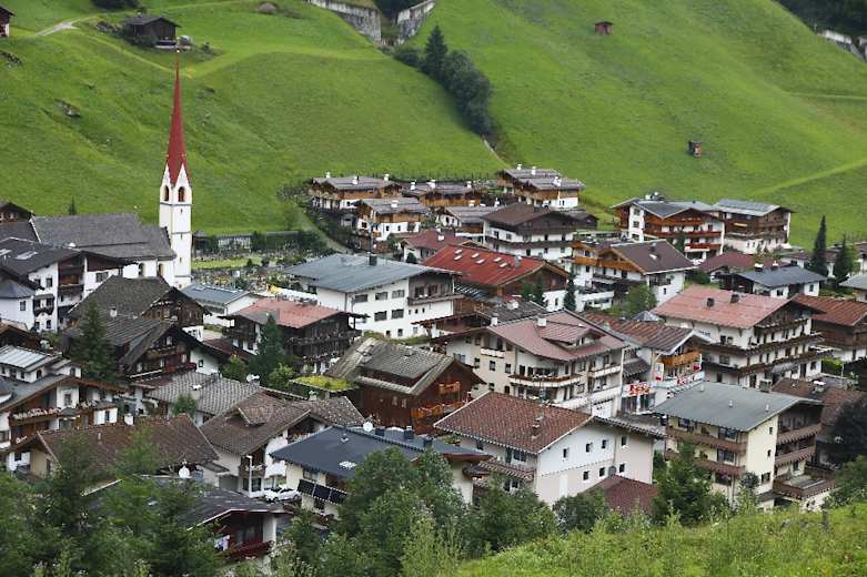 In angenehmem Schrägabstieg oberhalb der Höfe geht es zurück nach Lanersbach und im Ort an der Kirche vorbei zur Eggalmbahn.